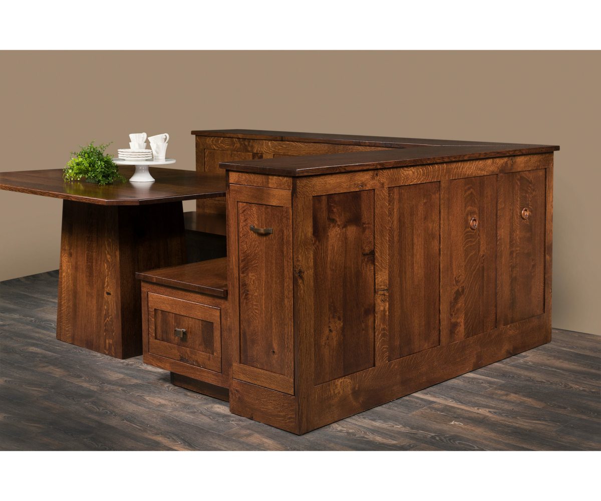 • Right-side bench has one drawer and pull-out door with shelves